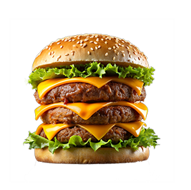 3 Steaks de boeuf smashés, cheddar, salade, oignons rouges, sauces au choix.