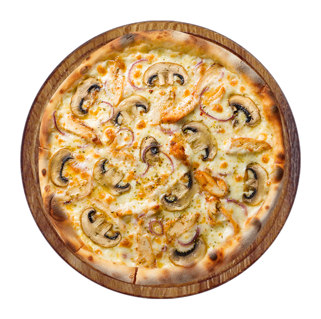 Crème curry, poulet, champignons, mozzarella.