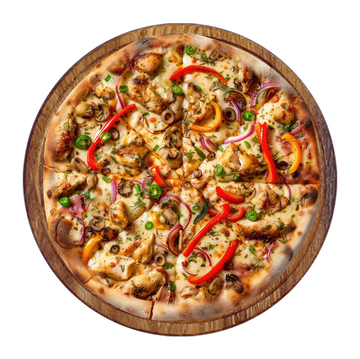 Crème de poivron rouge, poivrons, poulet, olives, carottes, mozzarella.